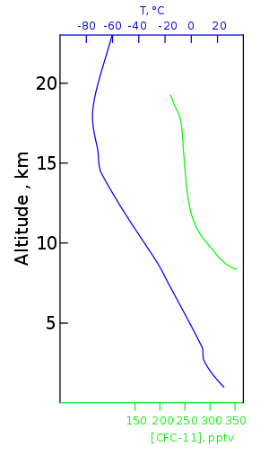 Иногда утверждается, что так как молекулы фреонов намного тяжелее азота и кислорода, то они не могут достигнуть стратосферы в значительных количествах. Однако атмосферные газы перемешиваются полностью, а не стратифицируются или сортируются по весу. Оценки требуемого времени для диффузионного расслоения газов в атмосфере требуют времён порядка тысяч лет. Конечно, в динамической атмосфере это невозможно. Процессы вертикального массопереноса, конвекции и турбулентности полностью перемешивают атмосферу ниже турбопаузы намного быстрее. Поэтому даже такие тяжёлые газы, как инертные или фреоны, равномерно распределяются в атмосфере, достигая в том числе и стратосферы. Экспериментальные измерения их концентраций в атмосфере подтверждают это, см. например справа график распределения фреона CFC-11 по высоте. Также измерения показывают, что требуется порядка пяти лет для того чтобы газы, выделившиеся на поверхности Земли, достигли стратосферы, см. второй график справа. Если бы газы в атмосфере не перемешивались, то такие тяжёлые газы из её состава, как аргон и углекислый газ, образовывали бы на поверхности Земли слой в несколько десятков метров толщиной, что сделало бы поверхность Земли необитаемой. Но это не так. И криптон с атомарной массой 84, и гелий с атомарной массой 4, имеют одну и ту же относительную концентрацию, что около поверхности, что до 100 км высоты. Конечно, всё вышесказанное справедливо только для газов, которые относительно стабильны, как фреоны или инертные газы. Вещества, которые вступают в реакции, а также подвергаются различным физическим воздействиям, скажем, растворяются в воде, имеют зависимость концентрации от высоты.