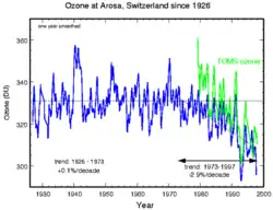Но если проследить усреднённую в течение каждого года динамику изменения концентрации озона и размера озоновой дыры в течение последних десятилетий, то имеется выраженная тенденция к падению средней концентрации озона в пределах огромной географической области.