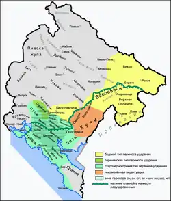 - преимущественно последовательное распространение иекавского типа произношения (je на месте праславянской *ě) как и в цетинско-барских и белопавличско-васоевичских говорах, но в группе rě отмечаются различия в рефлексах *ě: prijeć, priječac, но starešina, izgoret;