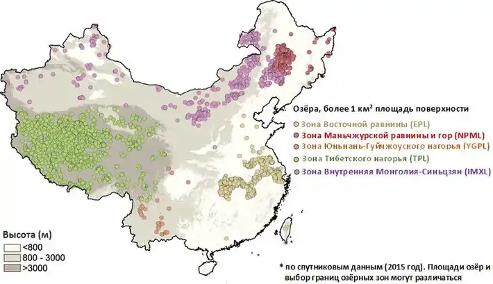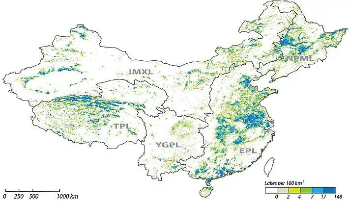 Озёра образуют два больших кластера на западе и востоке Китая[1]. Зона Тибетского нагорья (TPL) наиболее богата озёрами. По разным оценкам и для разных границ зоны на 2015 год, от 1047[10] до 1184[8] озёр площадью поверхности от 1 км² каждое (в сумме от 42,5[10]до 46,8 тысяч км²[8]). Озерный регион восточной равнины (EPL) представлен 469[10]-618[8] озёрами площадью поверхности от 1 км², в то время как в зоне Юньнань-Гуйчжоуского нагорья таких озёр меньше всего: 25[8]-72[11]. При этом оценки общего числа озёр Китая за 2015 год (с площадью поверхности от 1 км²) также различаются: от 2554 озёр[10] до 2919[11], как и их суммарные площади: от 74,4[10] до 81,8 тысяч км²[11][Прим. 3].