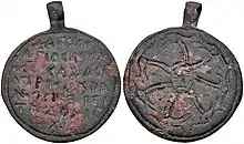 Цель применения амулета определяла материал для его изготовления и место приложения к телу. Традиция записывать эподы на папирусных лентах позаимствована, вероятно, из Египта. В качестве пластыря могли использоваться кусочки пергамента, их использование в таком качестве описано в «Чудеса Димитрия Солунского» (VI век). От бессонницы применяли амулеты из лаврового листа, а от лихорадки — из оливкового. Целебными свойствами, по мнению византийцев, обладал свинец, из него делались вотивные пластины и амулеты, его включали в лекарства и косметические снадобья[95]. Наиболее привлекательным материалом для защитных амулетов было золото, но его высокая стоимость заставляла прибегать к более дешёвым альтернативам — меди, железу, свинцу или иным материалам. Медь в качестве защиты от злых духов ценилась в силу известного византийцам рассказа о том, что царь Соломон держал пленённых им демонов в медных сосудах[96]. Наиболее распространённой формой амулетов были медали, металлические диски с разнообразной гравировкой. Как правило, они имеют круглую или овальную форму, но апотропеическим эффектом обладали также квадраты и восьмиугольники. Значительное количество амулетов-дисков, обнаруженных в ходе раскопок исаврийского города Анемуриум, датируется VI веком. Распространённым способом ношения амулетов было помещение их в ювелирные изделия, кольца, браслеты или ожерелья[97]. Помимо перечисленных, силой изгонять демонов, как считалось, обладали медные колокольчики, а также окрашенные нити с завязанными на них узелками. В целом, в качестве амулета мог использоваться практически любой небольшой предмет[98]. Помимо формы и материала, имел значение выбор чернил для нанесения надписи. Согласно известным инструкциям, для изготовления чернил следовало использовать растения, в которых живут добрые демоны, например, мирру. Также рекомендовалось использование крови животных или птиц, чаще всего голубей или петухов. Цвет чернил тоже оказывал своё влияние на результат магических усилий[99].