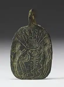 Некоторые иконографические типы амулетов отсылают к древним традициям, сочетающим разнообразные демонологические представления и легенды. Изображения «святого всадника», поражающего распростёртую женскую фигуру, связывают с верованиями в существование демона женского рода, поражающего детей и беременных женщин[89]. Имя демона на амулетах обычно не указывается, демоноборец отождествляется с различными персонажами, в том числе святым Сисиннием, Соломоном, ангелом Арлафом или одним из архангелов[90]. Несколько столетий длится дискуссия относительно амулетов с изображением женской головы с исходящими из неё 7 или 12 змееподобными лучами. В XVI веке Пирро Лигорио предположил, что они символизируют Медузу, но такое отождествление в настоящее время признано ошибочным. В русской и советской историографии змеиные амулеты связывали с болезнями матки и брюшной полости[91]. Также высказывалось предположение, что они восходят к греко-египетской символике Хнубиса и приобрели особенную популярность начиная с IX века[92][93]. Многие разновидности камня использовались как амулеты. В качестве амулета, предохраняющего беременных, особенно был популярен орлиный глаз; «Кираниды» сообщают и о других его свойствах[94].
