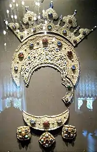 - Запоны — застёжка-украшение (растительный орнамент и завитки) с драгоценными камнями, закрепляемая шнуром, цепочкой или планкой;