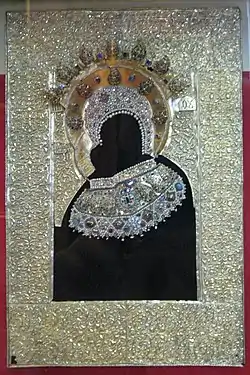 … венцы с жемчужной обнизью, украшенные изумрудами, сапфирами, альмандинами… 2 золотые звезды с крупными драгоценными камнями и жемчугом на золотых резных «оплечках»; сапфировые серьги. На полях оклада размещались золотые пластины с выполненными чернью изображениями 12 Господских и Богородичных праздников, перемежающиеся крупными самоцветами. …к образу были приложены 2 жемчужных убруса (очелья), 2 золотые цаты (вязаная и сканая) и 2 «ожерелья» (ворота). К серебряной вызолоченной гладкой «доске», украшенной «яхонтом лазоревым да изумрудом» и обнизанной по краям жемчугом, служащей своеобразной драгоценной ризой Богоматери и Младенца Христа, были прикреплены 5 золотых наперсных крестов с камнями и жемчугом, 13 панагий. Одна из панагий содержала «часть Животворящего Древа Господня», другие кресты и панагии — святые мощи.