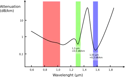 Затухание сигнала в оптическом волокне обусловливается двумя основными факторами — рэлеевским рассеянием и инфракрасным поглощением. С ростом длины волны рассеяние уменьшается пропорционально четвёртой степени частоты, а поглощение — наоборот — возрастает. В то же время присутствующие в оптическом волокне ионы OH создают области сильного поглощения, называемые водяными пиками. Центральные частоты водяных пиков приходятся на длины волн 1290 и 1383 нм. Применение технологии очистки оптического волокна позволило уменьшить потери в водяном пике на длине 1383 нм до величины 0,31 дБ/км, что уже меньше потерь во втором окне прозрачности (0,35 дБ/км)[2].