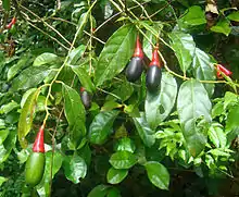 Плоды — шаровидные или продолговатые ягоды, 3-5 см в длину, твёрдые и мясистые, в месте соединения цветоноса с плодом покрыты чашевидной, иногда плоской чашечкой[12], что придает им внешнее сходство с желудем. Плоды тётемно-зеленые, постепенно темнеющие по мере созревания. Чашечка у основания ягоды может быть более ярко окрашена. Плод содержит одно семя, покрытое твердой оболочкой, и может быть слегка лигнифицирован.