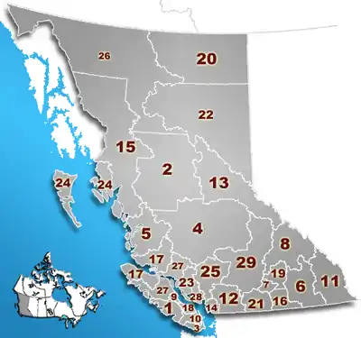 1. Алберни-Клейокуот 2. Балкли-Нечако 3. Капитал 4. Карибу 5. Сентрал-Кост 6. Сентрал-Кутеней 7. Сентрал-Оканаган 8. Коламбия-Шасвоп 9. Комокс-Вэлли 10. Ковичан-Вэлли 11. Ист-Кутеней 12. Фрейзер-Вэлли 13. Фрейзер-Форт-Джордж 14. Метро-Ванкувер 15. Китимат-Стикин 16. Кутеней-Баундари 17. Маунт-Уэддингтон 18. Нанаймо 19. Норт-Оканаган 20. Нортерн-Рокиз 21. Оканаган-Симилкамин 22. Пис-Ривер 23. Пауэлл-Ривер 24. Норт-Кост 25. Скуомиш-Лиллуэт 26. Стикин 27. Страткона 28. Саншайн-Кост 29. Томпсон-Никола