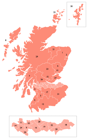 Для целей местного самоуправления в 1996 году решением Парламента Великобритании Шотландия была разделена на 32 округа, называемых также территориями местных советов (council areas). Каждый из этих округов управляется соответствующим местным Советом.