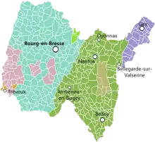 - Pont-de-Vaux, Bourg, Nantua, Gex, Belley, Saint-Rambert, Montluel, Trévoux, Châtillon-les-Dombes