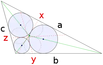 Центр окружности, касающейся двух сторон треугольника, что наблюдается у окружностей Мальфатти, должен лежать на одной из биссектрис треугольника (зелёные отрезки на рисунке). Эти биссектрисы делят треугольник на три меньших треугольника, и построение Штейнера окружностей Мальфатти начинается с построения вспомогательных трёх окружностей (показанных на рисунке пунктиром), вписанных в эти три треугольника. Каждая пара вспомогательных окружностей имеет две общие касательные. Одна из этих касательных является биссектрисой, а вторая показана на рисунке красным пунктиром. Обозначим стороны треугольника буквами a, b и c, а три касательные, не являющиеся биссектрисами, буквами x, y и z, где x является общей касательной окружностей, не касающихся стороны a, y является общей касательной окружностей, не касающихся стороны b, а z является общей касательной окружностей, не касающихся стороны c. Тогда три окружности Мальфатти — это вписанные окружности трёх четырёхугольников abyx, aczx и bczy[15] Три общих касательных x, y и z пересекают стороны треугольника в точках касания вспомогательных окружностей, а потому могут быть найдены как отражения биссектрис относительно прямых, соединяющих пары центров этих окружностей [10].