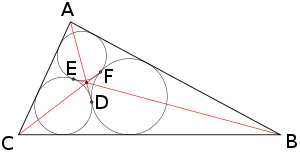 Пусть дан треугольник ABC и его три окружности Мальфатти, пусть D, E и F — точки, где две окружности касаются, противоположные вершинам A, B и C соответственно. Тогда три прямые AD, BE и CF пересекаются в одной замечательной точке, известной как первая точка Адзимы — Мальфатти. Вторая точка Адзимы — Мальфатти — точка пересечения трёх прямых, соединяющих точки касания окружностей Мальфатти с центрами вневписанных окружностей треугольника[17][18]. Другие центры треугольника, связанные с окружностями Мальфатти, включают точку Иффа-Мальфатти, образованную таким же способом, что и первая точка Мальфатти, из трёх взаимно касающихся окружностей и (продолженных) сторон треугольника, но частично лежащих вне треугольника,[19] и радикальный центр трёх окружностей Мальфатти[20].