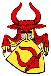 Описание герба: D'or à un crâne de boeuf de gueules. Casque couronné Cimier le crâne |