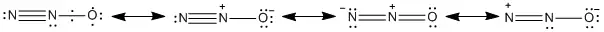 Строение молекулы оксида азота(I) описывается следующими резонансными формами: