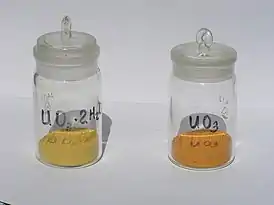 Образует кристаллогидраты состава UO3·n H2O, где n = 1, 2, 6.