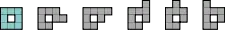 - 1 октамино (изображено сине-зелёным) имеет четыре оси симметрии — две параллельных линиям сетки и две диагональных.