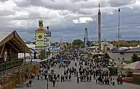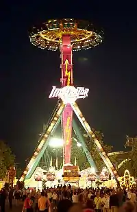 - Колесо обозрения появилось на Октоберфесте впервые в 1880 году и имело высоту 12 метров. С 1978 года имеет высоту 50 метров, вместимость — 192 человека и массу в 540 тонн[34]. Колесо обозрения позволяет посетителям осмотреть окрестности с достаточно большой высоты. В солнечную погоду с него можно увидеть Альпы.[34]
