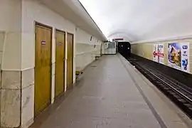 Пилонная станция глубокого заложения (глубина — 50 метров) с тремя сводами. Сооружена по проекту архитекторов А. Ф. Стрелкова, Н. А. Алёшиной и Ю. В. Вдовина. Станция возведена коллективом СМУ-8 Метростроя под рук. П. С. Бурцева, впервые на глубоком заложении применившего при строительстве предунифицированные блоки[1]. Диаметр центрального зала — 8,5 метра. Пилоны отделаны светло-серым мрамором, путевые стены — белой и (снизу) чёрной керамической плиткой; пол выложен красным и серым гранитом. Светильники находятся в карнизах верхних частей пилонов.