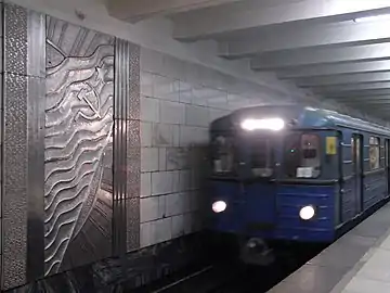 Путевые стены облицованы белым коелгинским и тёмно-серым газганским мрамором. Их украшают художественные панно из кованого алюминия, на каждом из которых изображено развёрнутое знамя с пятиконечной звездой, серпом и молотом на фоне солнечного диска (художники Дж. Я. Бодниекс, Х. М. Рысин). Лестничные спуски отделаны крупноразмерной плиткой[5]. Пол выложен светлым газганским мрамором, вдоль колонн проложена дорожка из розового мрамора буровщина. Светильники скрыты в ребристом потолке. Для облицовки овальных[5] каннелированных колонн впервые в метрополитене Москвы использовался профильный анодированный алюминий[6], по цвету хорошо сочетающийся с сероватыми путевыми стенами[7].