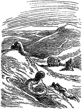 …У животного не было заметно ни ног, ни даже рта или глаз; правда, последние могли быть незаметны на расстоянии. Больше всего животное походило на обрубок толстой колбасы около метра длины. Оба конца были тупые, и разобрать, где голова, где хвост, было невозможно. Большой и толстый червяк, неизвестный житель пустыни, извивался на фиолетовом песке[1].