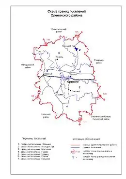 В Оленинский район, с точки зрения административно-территориального устройства области, входили 7 поселений[27][28].