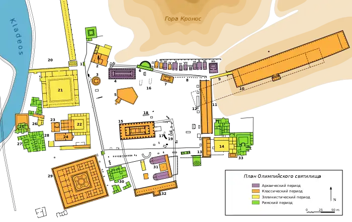 В центре расположена Священная роща (Алтис) — огороженное четырёхугольное пространство, на котором находились храмы. К востоку от Алтиса расположен стадион и, далее, ипподром (за пределами данного плана). За северной стеной, у подножия холма, находились сокровищницы с дарами городов. К западу — гостиницы и учебно-тренировочные площадки для атлетов, а также мастерская, где Фидий, предположительно, работал над статуей Зевса Олимпийского. К югу от Священной рощи располагалось место заседания олимпийского совета (булетревейон).