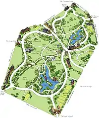 По замыслу конкурсантов, посетителей парка следовало как можно быстрее увлечь подальше в глубину зоны отдыха, для чего была спроектирована вереница извилистых аллей, ведущих прочь от городских улиц. В частности, один из таких путей вёл от главного входа на пересечении Пятой авеню и 59-й улицы по направлению к центру, где предполагалось расположить не слишком протяжённую центральную аллею с вязами, обозначенную как «променад» (в настоящее время известна как «Молл»). Особое внимание уделялось приданию территории провинциального, сельского, образа с живописными водоёмами и изобилием древесной растительности, а также при практически полном отсутствии помпезных и официальных элементов, свойственных многим королевским садам Европы[41]. Для дополнительного воплощения загородной идиллии сквозные транспортные проезды следовало опустить ниже уровня земли, и огородить забором и густым кустарником[42]. Помимо Олмстеда и Вокса, деятельное участие в проектировании Центрального парка принял британский архитектор Джейкоб Моулд[43][44].
