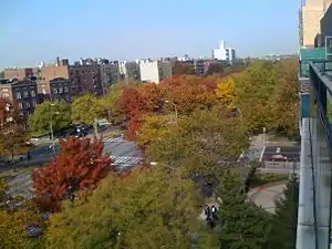 В Буффало Олмстед и Вокс последовательно перешли к концепции создания парковых комплексов, то есть серии разноплановых мест отдыха в различных частях города, соединённых между собой аллеями наподобие Елисейских полей или Авеню Фош в Париже[комм 15]. Идея широких улиц бульварного типа, предназначенных как для движения на повозках, так и для пеших прогулок, была предложена и затем реализована ещё при обустройстве пространства вокруг Проспект-парка в 1866 году. Ведущие к нему проспекты были обсажены вязами с обширными кронами, и получили названия Eastern Parkway и Ocean Parkway, а сам неологизм «parkway» («парквэй», в буквальном переводе «парковый путь»), введённый в обиход Олмстедом и Воксом, в дальнейшем получил широкое распространение на востоке США и в Канаде[104][105][106]. В Буффало были спланированы три парковых зоны. Центральной и самой большой (1,52 км²) из них стало место для гуляний на северной окраине города, обозначенное партнёрами просто как «Парк» («The Park», в XX веке переименован в «Парк Делавер»). Согласно плану, от него расходящиеся лучевые аллеи должны были вести к двум другим паркам города: одному, расположенному на берегу озера Эри и вытекающей из него реки Ниагары («The Front»), и другому на востоке Буффало («The Parade», ныне Парк имени Мартина Лютера Кинга). Если в первом случае авторы продолжили традицию воссоздания «пасторальных» пейзажей с лесами, озёрами и лужайками, то две другие зоны отдыха подразумевали иную функциональную направленность. На скалистом берегу Эри и Ниагары была построена широкая терраса для любования водными просторами, а парк «Parade» был предназначен для социальных мероприятий: пикников, встреч, спортивных игр и военных тренировок[107].