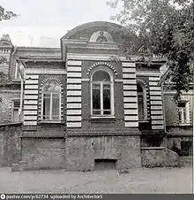 Главный корпус был каменным и имел два этажа. Красный кирпичный фасад был украшен белым декором. Корпуса выделялись резким контрастом красного кирпича и белых декоративных деталей. До наших дней дошли небольшие фрагменты мозаик с изображениями Пантелеймона Целителя и Святой Ольги[4].