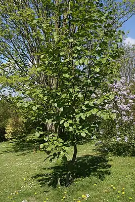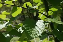 Почки сидячие, длиной 1—1,3 см. Листья широко- или округло-яйцевидные, длиной 7—10 см, шириной 7—8 см, с широким, часто, сердцевидным основанием, мелкопильчатые, с тонкими длинными зубцами, на черешках длиной 1—3 см.