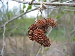 Слева направо: тычиночные серёжки, шишки, плоды | ||||||||||