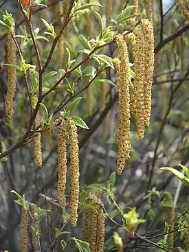 Тычиночные серёжки одиночные или парные, длиной 5—7 см, распускаются в марте — апреле.