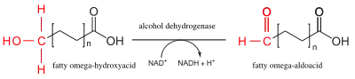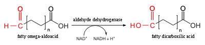 | 3. | Окисление | Альдегиддегидрогеназа | Альдегидная группа окисляется до карбоксильной, в результате чего образуется жирная кислота с карбоксильной группой на каждом конце[2]. | ![]() |