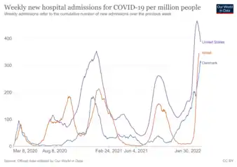 Быстрое распространение омикрон-штамма[3] и увеличение числа заболевших[32] ведёт к росту нагрузки на систему здравоохранения[3] и риску её перегрузки[20], а снижение доли тяжёлых форм на фоне растущего числа заражённых фактически приводит к тому, что абсолютное число тяжёлых больных не снижается или даже растёт[33]. Так, в ряде стран, например, США, Израиле и Дании, волна заражений омикроном уже вызвала рекордное число госпитализаций.
