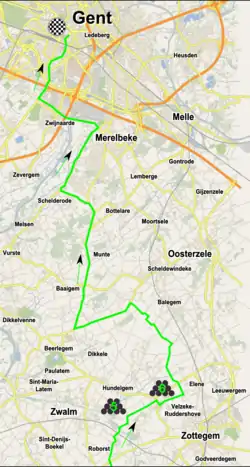 Старт и финиш гонки находились в Генте. Гонщикам предстояло преодолеть 200,8 километров с тринадцатью сложными подъёмами, часть из которых с брусчатым покрытием и десятью плоскими брусчатыми участками.[1]
