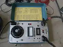 - Измеритель сопротивления заземления — специальный омметр для измерения переходных сопротивлений в устройствах заземления