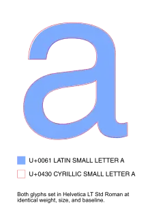 Заглавную букву О и цифру 0 легко можно перепутать. Омоглифы могут возникать при использовании разных алфавитов. Латинская буква H (xa), буква кириллицы Н (эн) и греческая буква Η (эта) трудноотличимы друг от друга (во многих шрифтах совершенно одинаковы). Большое количество омоглифов с другими алфавитами содержится в азбуке чероки, автор которой, по наиболее принятой версии, исходно позаимствовал их знаки для новой системы письма, придав им совершенно другое звучание.
