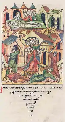 Смерть посадника Онаньи (верхняя часть миниатюры). Иллюстрация из рукописи XVI века