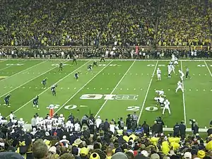 Попытка онсайд-кика в матче колледжских команд Пенн Стэйт (в белой форме) и Мичигана (в тëмной форме)