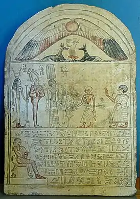 ![]() Стела с изображением Меретитефа (музыканта Тефнут), совершающего возлияния Онурису, Осирису и Исиде | |||||||