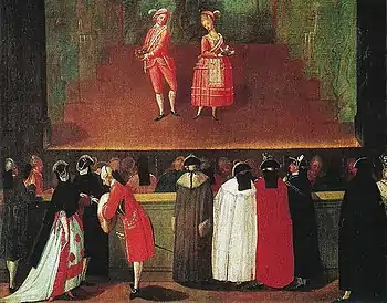 В Италии во второй половине XVII века доминировала венецианская школа, ориентированная на зрелищность, даже музыка здесь превратилась в элемент декора: успех спектакля зависел не столько от композиторов или певцов, сколько от художников-декораторов и специалистов по сценической машинерии; либреттист, сочиняя текст, должен был учитывать технические возможности конкретного театра[103][104]. Тем не менее даже в публичных театрах Рима ставились оперы, сочинённые в Венеции или в венецианской традиции, хотя именно в этом городе в конце столетия сложилась оппозиция господствующему вкусу[105][106].