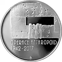 24 мая 2017 года Чешский национальный банк ввёл в обращение памятную серебряную монету достоинством в 200 чешских крон (диаметр 31 мм, масса 13 г, тираж 17000 экземпляров). На аверсе монеты изображена часть повреждённого взрывом автомобиля Гейдриха с надписями «ČESKÁ REPUBLIKA» и «200 Kč». На реверсе монеты изображены изрешечённое пулями окно крипты церкви Кирилла и Мефодия и пожарные рукава, с помощью которых атакующие закачивали воду в подвал. В нижней части реверса находятся надписи «OPERACE ANTHROPOID», «1942-2017» и инициалы дизайнера монеты Ирены Градецкой — переплетённые буквы «I» и «H»[65]. В этом же году Чешский монетный двор выпустил золотую памятную медаль, посвященную операции «Антропоид» (диаметр 28 мм, масса 15,56 г, тираж 99 экземпляров)[66]. Посвящённые операции «Антропоид» памятные медальоны из золота и серебра выпускал также Пражский монетный двор.
