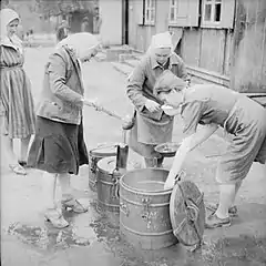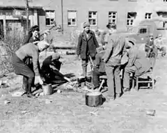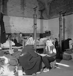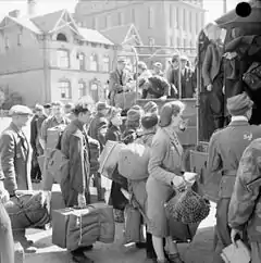 Репатриируемые лица могли иметь при себе только ручную кладь (хотя формальных ограничений на массу перевозимого груза не было, но череда пеших переходов между перевозками на машинах и на поездах делала невозможной транспортировку чего бы то ни было сверх переносимого на себе).[28] Для целей обеспечения транзита была создана система пересыльных лагерей и сборно-пересыльных пунктов. Советской властью признавалось то, что негативное влияние на репатриацию оказал просуществовавший до августа 1946 года гулаговский режим в лагерях: запрет свободного выхода из зоны якобы в интересах безопасности местного немецкого населения, ограждение лагерей колючей проволокой во избежание побегов, установление вышек и постов, прожектора по ночам, конвоирование репатриантов при выходе из лагеря на работы и так далее.[29]