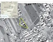 Воздвигнутая в 2004 году трёхэтажная[27] постройка была расположена в конце узкой грунтовой дороги[28]. На картах «Google Планета Земля» видно, что укрытия не было в 2001 году, но оно есть на снимках, сделанных в 2005 году[29]. Постройка располагалась в 4 километрах к северо-востоку от центра Абботтабада[25]. Абботтабад расположен примерно в 160 км от границы с Афганистаном (около 30 км от Индии). Укрытие располагалось в 1,3 км к юго-западу от Пакистанской военной академии[4], на земельном участке, в восемь раз большем, чем у соседних домов, и было окружено бетонными стенами высотой 3,7—5,5 м[26] с колючей проволокой[25].