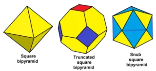 ) представляет псевдоикосаэдр, правильный икосаэдр с пиритоэдральной симметрией. Плосконосый октаэдр является альтернированной формой усечённого октаэдра, (![]()