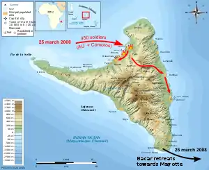 26 марта 2008 года на Ндзуани десантировались силы этих стран[1]. После череды непродолжительных столкновений остров был взят под контроль Африканским союзом, а сам Мохамед Бакар переоделся в женское платье и бежал на Майотту.