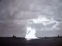 ![]() Грибообразное облако, у которого вместо пылевой ножки водяной столб. Справа на столбе видна прореха: линкор «Арканзас» (англ. USS Arkansas [BB-33]) закрыл собой выброс брызг. Испытание «Бэйкер», 25 июля 1946 года | |