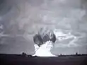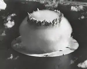 ![]() Атмосферный ядерный взрыв 1 июля 1946 года. Фотография сделана с башни на острове Бикини на расстоянии 5,6 км. | |