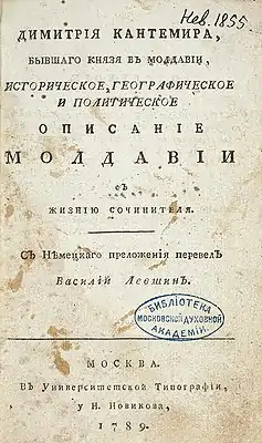 - Ермуратский В. Н. Дмитрий Кантемир и его Описание Молдавии // Дмитрий Кантемир. Описание Молдавии. — Кишинев, 1973, c. XIV