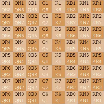 Клетки нумеруются от 1 до 8, при этом каждая из сторон даёт им номера от самой близкой к самой дальней. Например, клетку a1 белые называют QR1, чёрные — QR8.