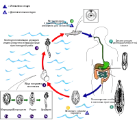 Конечные хозяева паразитов (человек, кошки, собаки, лисицы, песцы, хорьки и другие плотоядные животные) заражаются после поедания инвазированной рыбы. В желудке и начальном отделе тонкого кишечника конечного хозяина метацеркарии освобождаются от цист, после чего проникают через жёлчные протоки в жёлчный пузырь и жёлчные ходы печени. Здесь они через 10—12 дней достигают половой зрелости и начинают откладывать яйца. Яйца паразита, попавшие на почву, погибают в течение 8—10 дней, при попадании же в воду сохраняют жизнеспособность до года. В теле конечного хозяина паразит может обитать в течение 10—20 лет[14][15].